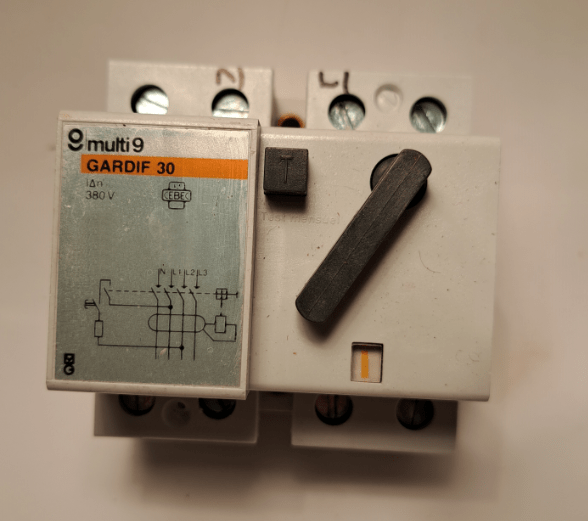 1 disjoncteur Gardif Multi9 triphasé avec différentiel pour la protection du réseau électrique contre les surcharges, les courants de fuite et les courts-circuits.