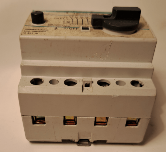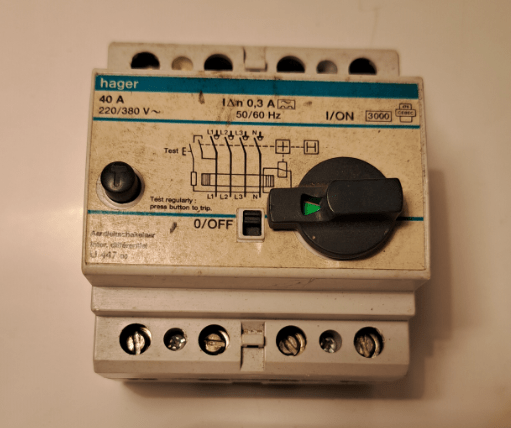 1 disjoncteur Hager triphasé avec différentiel pour la protection du réseau électrique contre les surcharges, les courants de fuite et les courts-circuits.